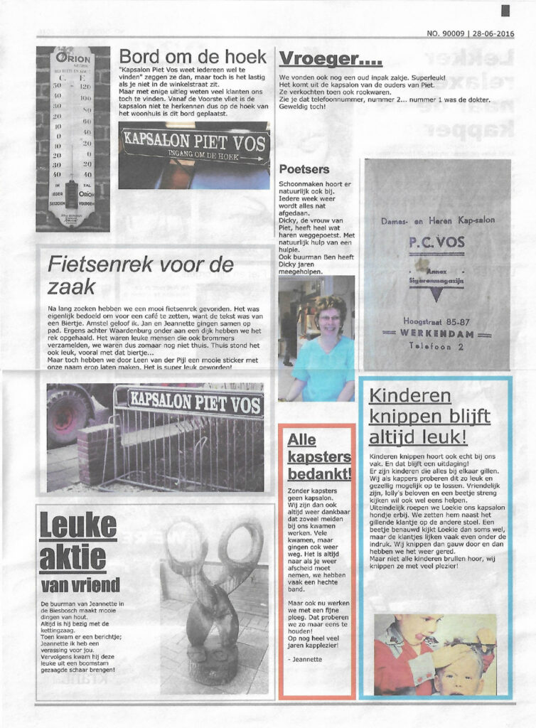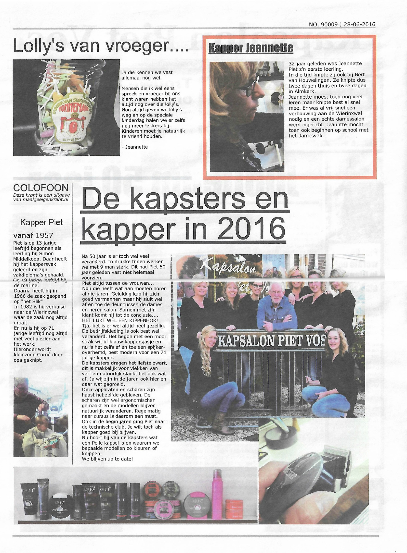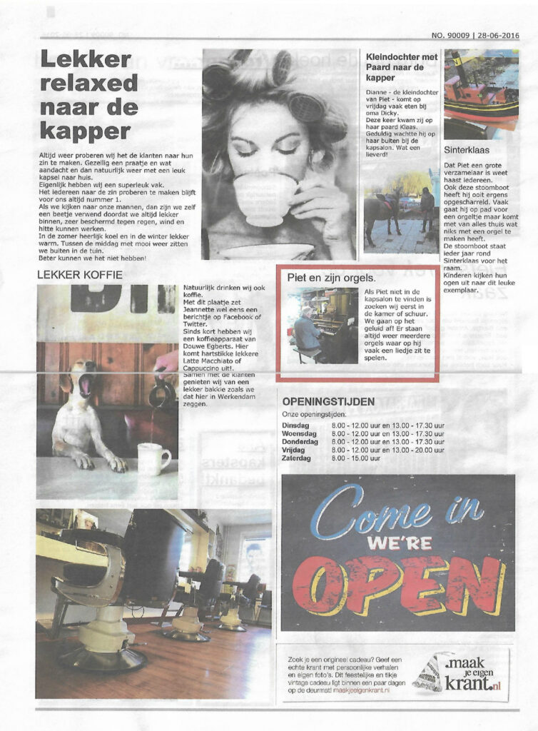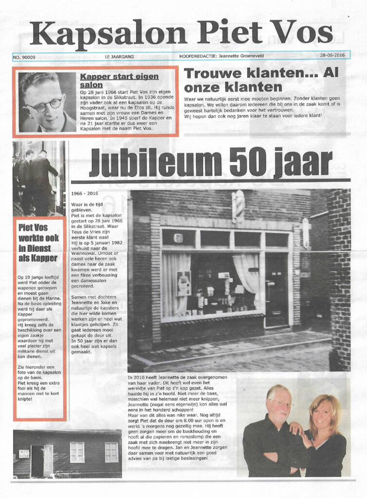 Na 37 jaar in het kappersvak gooi ik met ‘Knippen bij Jeannette’ het roer om. Op mijn vijftiende begon ik als hulpje in de kapperszaak van mijn vader, Piet Vos. In 2010 nam ik de kapsalon op het dorp van hem over. Vanwege gezondheidsredenen heb ik in de zomer van 2020 moeten besluiten het anders te gaan doen. Geen grote salon met groot team meer, maar alleen nog een kleine salon op de terp! Iedereen is welkom in de leukste kapsalon op het mooiste plekje van Nederland!